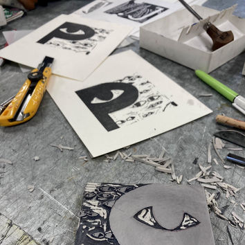 Chaque lettrine doit exprimer le sens du titre évoqué. Après un travail d’esquisses, le projet est réalisé en linogravure au Laboratoire d’expérimentations graphiques, puis mis en page sur indesign.
