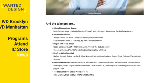 Ce workshop en ligne français-américain s'est tenu à l’initiative de Wanted Design et de l’ambassade de France aux USA. Les résultats pour Estienne sont excellents grâce à la participation de Nais et Alexiane, deux étudiantes de deuxième année en DSAA DCN. Le jury était composé d’Amélie DU PASSAGE (Petite friture) Matali Crasset, Julie Lasky (New York Times), John Edelman, Allan Chochinov (School of Visual Arts in New York City).