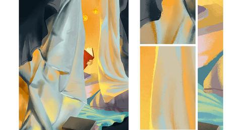 Projet réalisé à distance et en temps limité (7h), il s’agissait de réaliser en couleur l'étude d'un drapé de tissus, tout en interrogeant les thèmes du souvenir, des traces de la présence/absence du corps, de la disparition et de l’usure…
